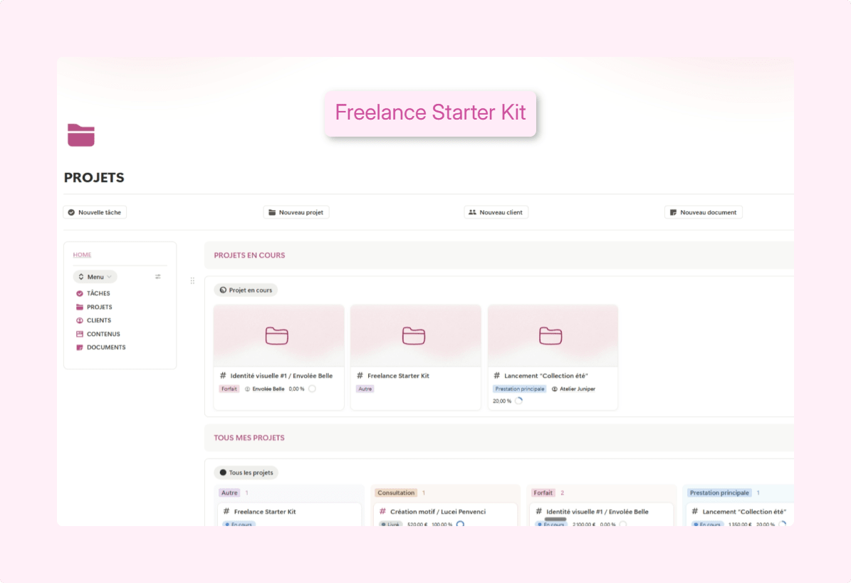 Le Freelance Starter Kit, c'est ton QG. Un espace Notion unique, pensé pour les freelances et créatrices qui démarrent, qui veulent se sentir pro sans passer 3 heures à configurer un outil.